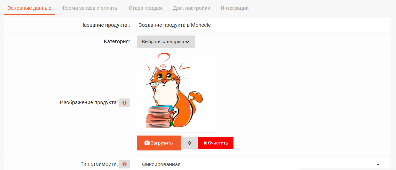 *далее откроется форма для настройки и заполнения продукта:
