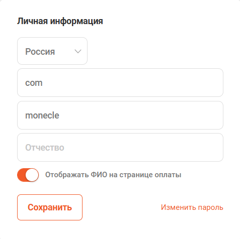 • Включить отображение ФИО на странице оплаты, чтобы покупатель видел ваши данные в момент оформления заказа